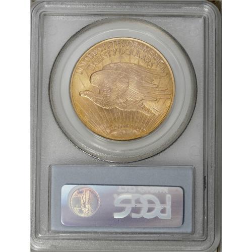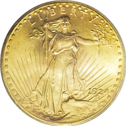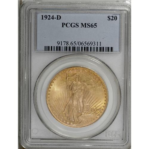 <B>1924-D $20 MS65 PCGS.</B></I> David Bowers (2004) writes that:<BR><BR> "Most (1924-D double eagles) were probably retained in the United States and melted in the mid-1930s. However, at least a couple of thousand were exported. Today, the 1924-D is quite scarce. However, offerings are frequent, due to a combination of more pieces being available and the curious situation, prevalent among numismatics, of buyers taking home a piece from an auction, then putting it back on the market soon thereafter. Sometimes a rare double eagle will do quite a bit of flitting around until it finds a lasting perch."<BR><BR> The reverse of this Gem displays vibrant orange-gold fields and light champagne highlights over the eagle's body. Free of even the slightest mentionable blemish, this side of the coin would easily merit at least an MS66 designation if it existed in a vacuum. While the obverse displays the same desirable contrasting coloration between the fields and central devices, it also reveals several wispy abrasions, as well as a somewhat noticeable one in the left field below Liberty's flowing hair, and a couple of more on the left (right facing) lower leg, that overrule this piece's bid for an even higher grade. Boldly defined throughout, the strike is admirable and powerfully draws forth every major detail, including nice definition on the fingers holding the olive branch and on the foot, as well as the eagle's torso feathers. An important, carefully preserved Gem specimen. Population: 4 in 65, 2 finer (10/06).<BR><BR><b>Shipping:</b> Coin/Currency (<a target="_blank" href="http://www.heritageauctions.com/common/shipping.php">view shipping information</a>)