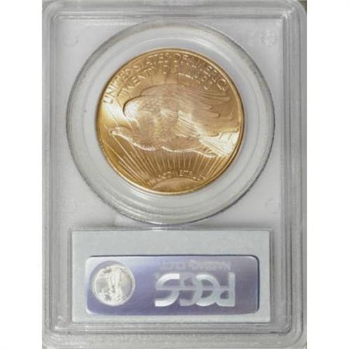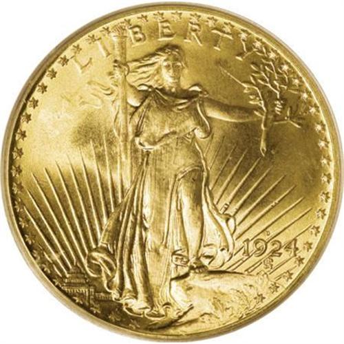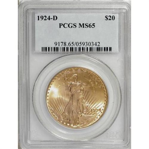 <B>1924-D $20 MS65 PCGS.</B></I> The 1924-D is one of the median rarities in the Saint-Gaudens series. It is similar in rarity to the 1925-D and 1926-S, especially in the better grades of Uncirculated. Apparently a mindset of frugality was present in the Denver Mint in 1924. All denominations struck there show a general lack of highpoint definition, although the occasional exception can be found to that general rule. This lack of striking detail was apparently related to an attempt to extend die life as much as possible. Even on double eagles from this year striking definition varies quite a lot. It is interesting to contrast this mindset and the coins produced from Denver in this year to those produced in the Philadelphia Mint in 1924. This particular coin shows remarkably strong detailing on all the design elements, and from looking at this piece by itself one would never know that there is variability in strike on 1924-D twenties.<BR> This is an absolutely splendid, high grade coin. Most will surely see this as upper-end, if not undergraded. When searching for abrasions that will help aid in tracing the pedigree of this important coin, the only one that is readily visible is a shallow scrape just below the olive branch on the obverse. The mint luster is outstanding, as usual on this issue, and it is frosted in nature rather than satiny which is normally found on most Denver coins. Only 17 Gems have been certified by both of the major services with a mere three coins finer (7/07).<BR><BR><B>Coin Engraver:</B> Augustus Saint-Gaudens<BR><BR><b>Shipping:</b> Coins & Currency (<a target="_blank" href="http://www.heritageauctions.com/common/shipping.php">view shipping information</a>\)