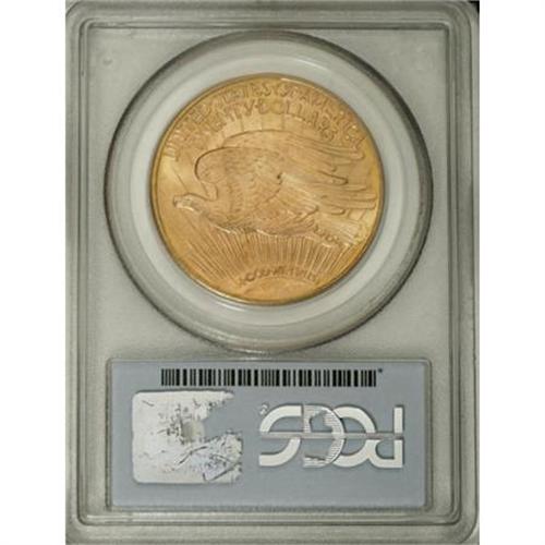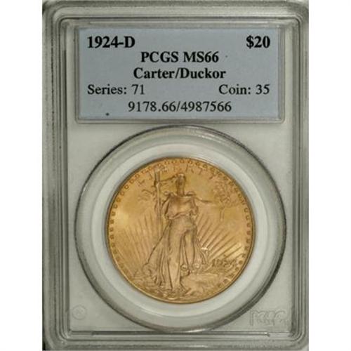 <B>1924-D $20 MS66 PCGS.</B></I> Ex: Carter/Duckor. What a difference a year makes in the unpredictable history of the remarkable Saint-Gaudens double eagle series! While the 1923-D issues are the poster children not only of Saint-Gaudens twenties in general but of the mintmarked coins in particular, before the mid-1950s the 1924-D was once considered quite rare. Today, with repatriations of a couple of thousand coins, the 1924-D is considered a medium rarity within the context of the series, about on par with the 1925-D and 1926-S issues. <BR> In 1923 the Denver Mint coined only silver dollars and double eagles, this a year after producing the notorious 1922 No D and Weak D cents. When the mint resumed the production of a full slate of coinage in 1924, it apparently was still attempting to make maximum use of the available dies. According to James L. Halperin, Mark Van Winkle, Jon Amato, and Gregory Rohan, the authors of <I>The Coinage of Augustus Saint-Gaudens as Illustrated by the Phillip H. Morse Collection, </B></I>"Striking characteristics vary, but many 1924-D twenties tend to show varying degrees of striking weakness, particularly at the peripheral areas. The dies were apparently kept in service for a long time during the production runs for this high mintage date. The couple of saved bags of coins alluded to earlier probably were struck from the latter die states of several die pairings."<BR> Jeff Garrett and Ron Guth note in their <I>Gold Encyclopedia,</B></I> "Survivors show strong luster and average strikes, but many have worn dies around the peripheries, as quality control was lacking (perhaps caused by the enormous amount of coins that were minted). To date, fewer than 1,000 examples have been certified, and a coin grading MS-64 is about as nice as a collector can hope to secure."<BR> Of course this coin has nothing to do with means, medians, or average strikes. It is a truly remarkable specimen, one of the two finest known to have survived both the melting pots at home and abroad and the ravages of excessive contact with other coins. Each side exhibits an even reddish-golden appearance, and the surfaces are satiny as would be expected for this date and mint. The strike is noticeably above-average, with sharp peripheral definition and well-defined feathers on the eagle's breast. Liberty's sandal reveals its customary but often overlooked heart-shaped clasp, and all of her toes are separated. <BR> Close examination reveals a few small abrasions: several on the figure of Liberty, one on the eagle's central feathers on the reverse. As an identifier, a group of three horizontal milling marks sits near the center of the sun at the base of the reverse. This is the second time we have had the pleasure of offering this phenomenal coin, and we are confident that it will become one of the cornerstones of a fine collection, as it has in past cabinets. Population: 2 in 66, none finer at either service (12/07).<BR><I>Ex: The Phillip H. Morse Collection of Saint-Gaudens Coinage (Heritage, 11/2005, lot 6667). <BR>From The Jacob Collection of Saint-Gaudens Double Eagles.</B></I><BR><BR><B>Coin Engraver:</B> Augustus Saint-Gaudens<BR><BR><b>Shipping:</b> Coins & Currency (<a target="_blank" href="http://www.heritageauctions.com/common/shipping.php">view shipping information</a>)