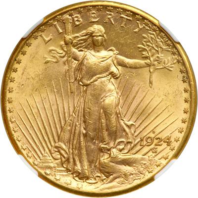 1924-D $20 St. Gaudens. NGC graded MS-63. Quite frosty with luster and all lightly toned. A scarce sought-after date. The 1924-D begins a run of rare mintmarked pieces that continues to the end of the Saint-Gaudens Double Eagle series in the early 1930s. The majority of Mint state survivors were found in European hoards of the 1950s, 1960s, and 1970s. Writing in 1988, Breen observed that a further 70 pieces surfaced in the summer of 1983. (Perhaps these formed part of the Central American hoard in which were released several Mint State 1909-D and 1922-S Double Eagles at around the same time.) The otherwise orange-gold color yields to warmer pinkish-rose hues toward the centers.