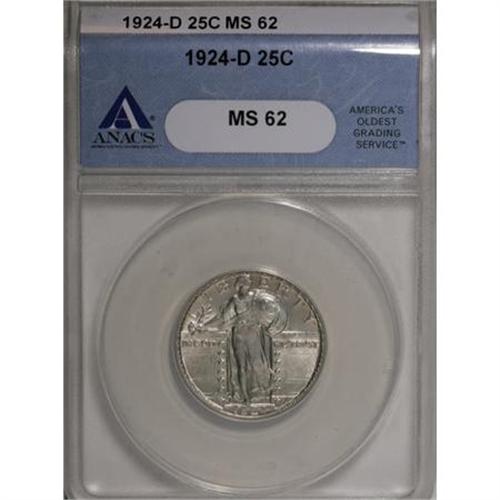 <B>1924-D 25C MS62 ANACS.</B></I> NGC Census: (23/1018). PCGS Population (47/1219). Mintage: 3,112,000. Numismedia Wsl. Price for NGC/PCGS coin in MS62: $250. (#5748)<BR><BR><B>Coin Engraver:</B> Hermon A. MacNeil<BR><BR><b>Shipping:</b> Coins & Currency (<a target="_blank" href="http://www.heritageauctions.com/common/shipping.php">view shipping information</a>)