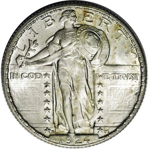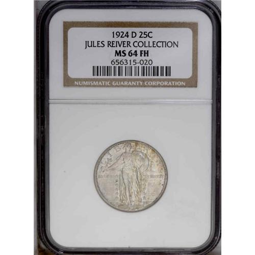 <B>1924-D<25C> MS64 Full Head NGC.</B></I> This is one of those hidden surprises among the coins from the Jules Reiver Collection. Examples of this issue are nearly always weakly struck, with only a partial date visible, and with little detail in Liberty's head. The example offered here is an exception to both of those points. Only the extreme tops of the digits in the date are a little weak. The head details are sharp and boldly detailed. Except for a tiny cheek chip, the head is essentially perfect. Fully brilliant and lustrous surfaces with a satiny cartwheel appearance and light ivory color. Splashes of yellow and orange toning are present on both sides, down the center of the obverse and primarily along the border of the reverse. Just a single point shy of being a landmark offering in the present collection.