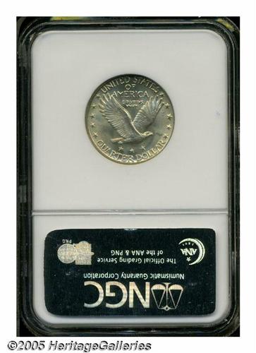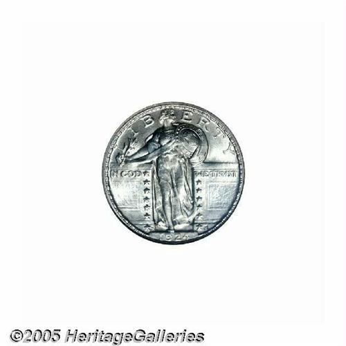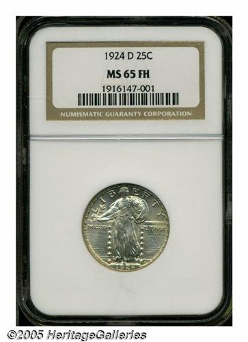 <B>1924-D<25C> MS65 Full Head NGC.</B></I> A median rarity in the series, this is an early die state with only slight softness at the top of the date. Bright and lustrous, the surfaces are light golden with a touch of lilac. Population: 24 in 65, 5 finer (5/05).