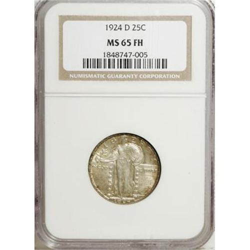 <B>1924-D 25C MS65 Full Head NGC.</B></I> Glints of silver-gold occur throughout the surfaces of this pretty Gem. Several of the central details are a bit on the soft side, including a couple of the shield rivets and the eagle's breast and forward wing edge, but the Full Head is unmistakable. A couple of die cracks are noticed on the obverse, including a fairly prominent one through the tops of the date, a further diagnosis of die fatigue. Census: 28 in 65, 9 finer (7/07).<BR><BR><B>Coin Engraver:</B> Hermon A. MacNeil<BR><BR><b>Shipping:</b> Coins & Currency (<a target="_blank" href="http://www.heritageauctions.com/common/shipping.php">view shipping information</a>\)