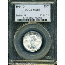 1924-D 25C MS65 PCGS. Booming luster traverses thi <B>1924-D 25C MS65 PCGS.</B></I> Booming luster traverses this brilliant and lovingly undisturbed Gem. The center of the head is typically struck, but the remainder of the devices are crisp. <BR><BR><B>Important notice:</B> Heritage usually auctions material at the rate of 200-250 lots per hour. On some occasions eBay Live bid software or the Internet may not be able to keep up with the pace of the auction. We recommend placing a realistic absentee bid now as insurance to avoid disappointment. Occasionally the auctioneer may eliminate or reject an eBay Live bid, and the auctioneer may also reopen a lot after the close of the eBay live bidding (usually because we missed an audience bid), and may reject your bid even if it shows you as the winning bidder. By bidding via eBay Live, you agree that Heritage may award the lot to another bidder at its sole discretion under the circumstances described above or any other reasonable circumstances. Since eBay bids are not shown to us until we open the lot on the floor, we treat those bids just like floor bids. In most cases the floor responds before the eBay bid is presented to us, due to Internet lag time, so for consistency we have made it a policy that floor bids are always considered first over tie eBay live bids. Also please note that all Heritage lots purchased through eBay Live carry a 20% Buyer's Premium. Please make sure you read the Terms and Conditions before you bid. This lot is being auctioned in conjunction with a live floor auction by Heritage Galleries & Auctioneers. All final auction and invoice information will be supplied by Heritage Galleries & Auctioneers, and all other information should be considered preliminary. Lot:5956