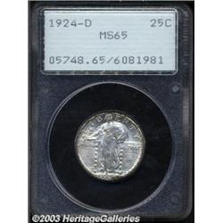 1924-D 25C MS65 PCGS. Hints of natural patina are seen over rich, frosty luster. Typically defined example for this date. Housed on an early PCGS holder. Important notice: Heritage usually auctions material at the rate of 200-250 lots per hour. On some occasions eBay Live bid software or the Internet may not be able to keep up with the pace of the auction. We recommend placing a realistic absentee bid now as insurance to avoid disappointment. Occasionally the auctioneer may eliminate or reject an eBay Live bid, and the auctioneer may also reopen a lot after the close of the eBay live bidding (usually because we missed an audience bid), and may reject your bid even if it shows you as the winning bidder. By bidding via eBay Live, you agree that Heritage may award the lot to another bidder at its sole discretion under the circumstances described above or any other reasonable circumstances. Also please note that all Heritage lots purchased through eBay Live carry a 20% Buyer's Premium. Please make sure you read the Terms and Conditions before you bid.