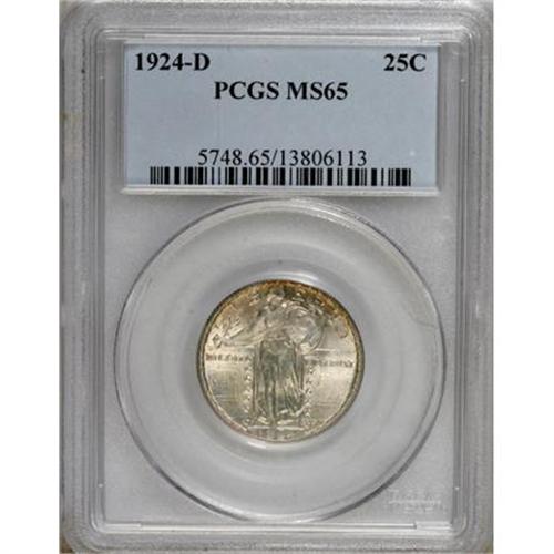 <B>1924-D 25C MS65 PCGS.</B></I> PCGS Population (427/94). NGC Census: (380/282). Mintage: 3,112,000. Numismedia Wsl. Price for NGC/PCGS coin in MS65: $440. (#5748)<BR><BR><B>Coin Engraver:</B> Hermon A. MacNeil<BR><BR><b>Shipping:</b> Coins & Currency (<a target="_blank" href="http://www.heritageauctions.com/common/shipping.php">view shipping information</a>)