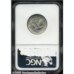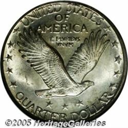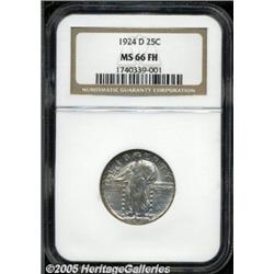 <B>1924-D 25C MS66 Full Head NGC.</B></I> A difficult date to locate in Gem grades, and particularly so with the Full Head designation. This one is quite pleasing for the frosty luster, sharp strike and undisturbed surfaces. White in color save for a hint of rose gold near the date and a few flecks of dark gold on the reverse. The date shows some weakness particularly on the 4, but this digit is still clear with a loupe. An outstanding example for the specialist. Population: 3 in 66, 2 finer (2/05).