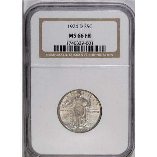 <B>1924-D<25C> MS66 Full Head NGC.</B></I> A difficult date to locate in Gem grades, and particularly so with Full Head designation. This piece is pleasing and displays frosty luster with virtually undisturbed surfaces. White overall save for hints of rose-gold on the obverse and a few flecks of dark gold on the reverse. The date shows some weakness, which is typical for the issue, particularly on the 4, but this digit is still clear with a loupe. An outstanding example for the specialist. Census: 6 in 66, 2 finer (9/06).
