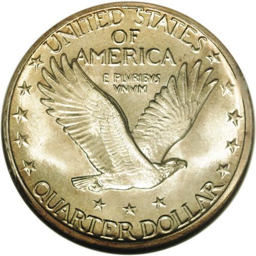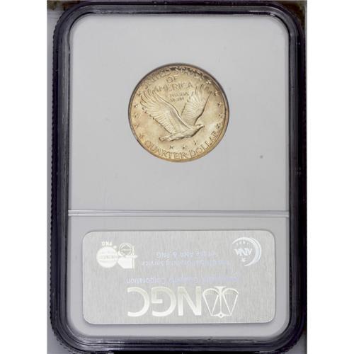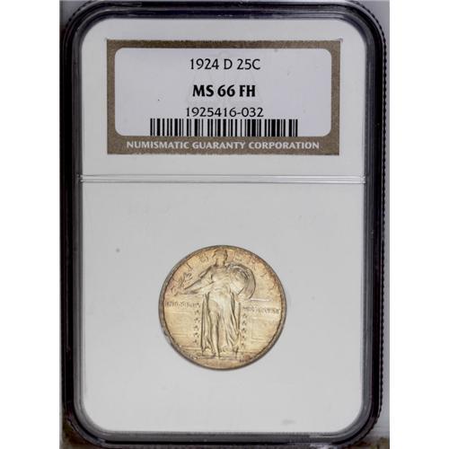 <B>1924-D<25C> MS66 Full Head NGC.</B></I> This is one of the most important opportunities in the present offering of Standing Liberty quarter dollars. Not only is the head detail strong, but the shield detail is also very sharply defined. The specialist will immediately recognize how unusual this is. This issue is plagued by weak strikes and is one of the poorest produced issues among all Standing Liberty quarters. Each side shows an abundant overlay of reddish-golden patina. Census: 4 in 66, 2 finer (3/06).