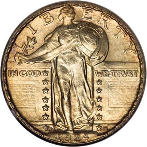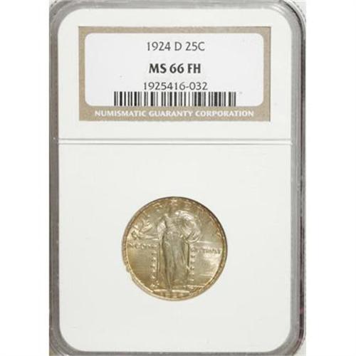 <B>1924-D 25C MS66 Full Head NGC.</B></I> Not only is the head detail strong, but the shield detail is also very sharply defined. The specialist will immediately recognize how unusual this is. This issue is plagued by weak strikes and is one of the poorest-produced issues among all Standing Liberty quarters. Each side shows an abundant overlay of reddish-golden patina. This is one of the most important opportunities in the present offering of Standing Liberty quarters. Census: 9 in 66 Full Head, 2 finer (10/07). <BR><I>From The Hoffy Collection, NGC's #3 Registry Collection of Standing Liberty Quarters.</B></I><BR><BR><B>Coin Engraver:</B> Hermon A. MacNeil<BR><BR><b>Shipping:</b> Coins & Currency (<a target="_blank" href="http://www.heritageauctions.com/common/shipping.php">view shipping information</a>)