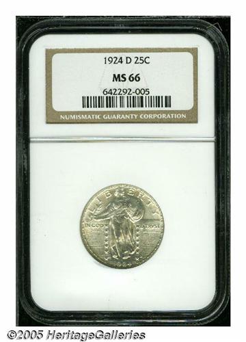 <B>1924-D<25C> MS66 NGC.</B></I> Frosty white and easily a Premium Gem, but displaying the typical softness at the top of the date and on Liberty's head. Traces of dark toning are visible on the reverse.
