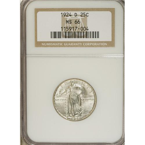 <B>1924-D 25C MS66 NGC.</B></I> Well struck with a touch of ice-blue patina in the fields. The otherwise silver-white surfaces display only the tiniest of flaws, most of which appear in the reverse fields, well away from the devices. An attractive example of this Type Two Denver issue.<BR><BR><b>Shipping:</b> Coins & Currency (<a target="_blank" href="http://www.heritageauctions.com/common/shipping.php">view shipping information</a>)