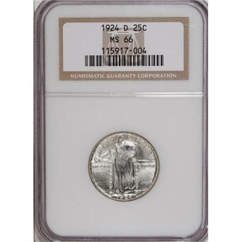 <B>1924-D 25C MS66 NGC.</B></I> Well struck with a touch of ice-blue patina in the fields. The otherwise silver-white surfaces display only the tiniest of flaws, most of which appear in the reverse fields, well away from the devices. An attractive example of this Type Two Denver issue.<BR><BR><B>Coin Engraver:</B> Hermon A. MacNeil<BR><BR><b>Shipping:</b> Coins & Currency (<a target="_blank" href="http://www.heritageauctions.com/common/shipping.php">view shipping information</a>)
