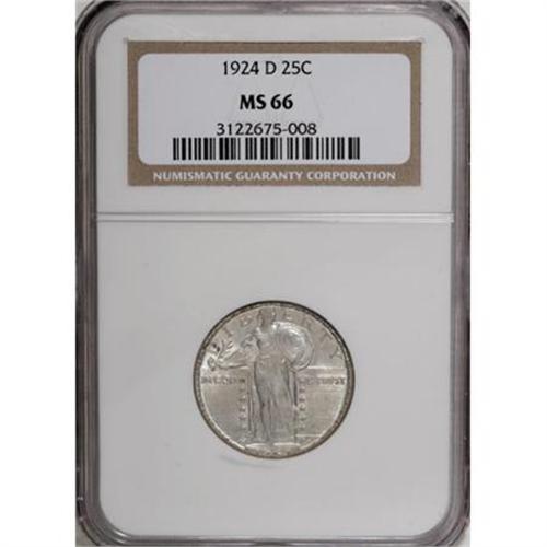 <B>1924-D 25C MS66 NGC.</B></I> The silver-blue surfaces of this attractive Premium Gem host devices that are pleasingly detailed in general, though softness is noted on Liberty's head. Eminently appealing, with just 43 finer pieces graded by NGC (1/08).<BR><I>From The John Stimson, Sr. Collection, Part Two.</B></I><BR><BR><B>Coin Engraver:</B> Hermon A. MacNeil<BR><BR><b>Shipping:</b> Coins & Currency (<a target="_blank" href="http://www.heritageauctions.com/common/shipping.php">view shipping information</a>)