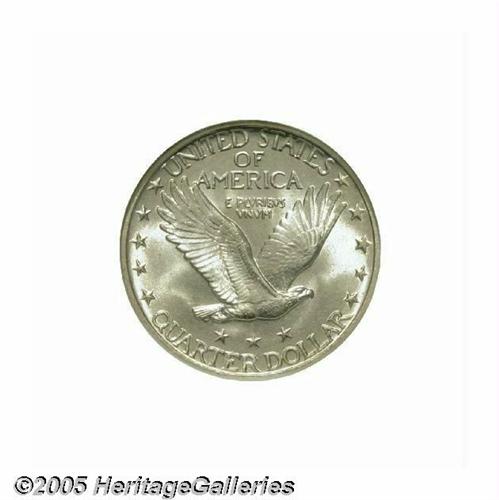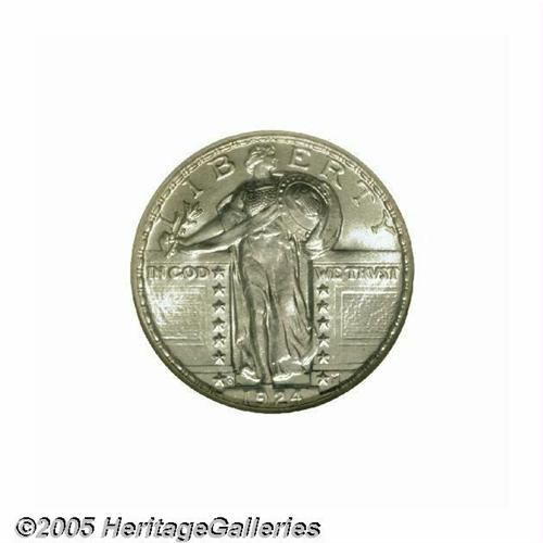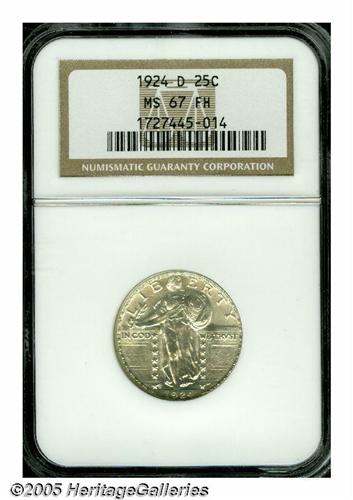 <B>1924-D<25C> MS67 Full Head NGC.</B></I> As the Standing Liberty Quarter design entered its ninth year, the practical shortcomings of MacNeil's original design had become obvious and led to a modification of the existing hubs in order to situate the date in a more recessed position. The last year of the Type Two or raised date design, 1924 also witnessed one of the worst produced issues of the entire series. The vast majority of the 3,112,000 Quarters that were produced by the Denver Mint this year display poorly delineated features. Furthermore, the obverse die cracked at an early stage and resulted in most Mint State survivors missing the top portion of the date. The radiant, untoned Gem offered here apparently preceded these problems in production. Save for trivial softness of strike on a few of the shield rivets, all other details are incredibly sharp, right up to the top of all four digits in the date. Population: 2 in 67, 0 finer (6/05).<BR><I>From The Robert Moreno Collection.</B></I>