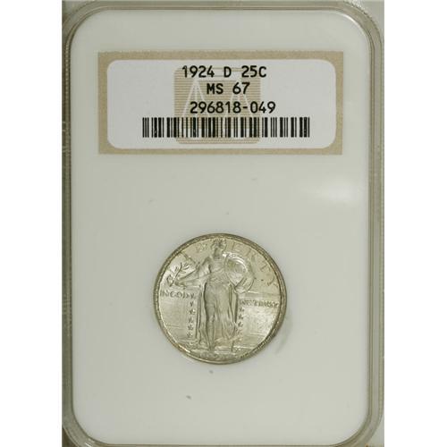 <B>1924-D 25C MS67 NGC.</B></I> Silvery surfaces with just a hint of smoke-gray characterize this lovely, brilliant Superb Gem. The head details fall just short of Full Head status, but the strike overall is pleasing and well executed. Census: 40 in 67, 1 finer (1/07).<BR><BR><b>Shipping:</b> Coins & Currency (<a target="_blank" href="http://www.heritageauctions.com/common/shipping.php">view shipping information</a>)