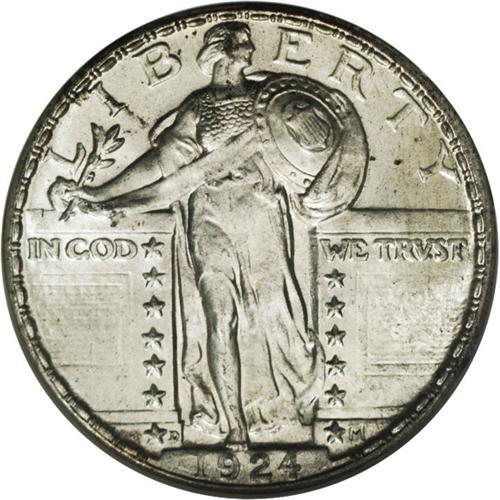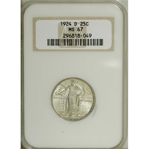 <B>1924-D 25C MS67 NGC.</B></I> Silvery surfaces with just a hint of smoke-gray characterize this lovely, brilliant Superb Gem. The head details fall just short of Full Head status, but the strike overall is pleasing and well executed. The digits in the date are surprisingly bold with only slight softness at the top of the 1 and 4, and there is no trace of the usually seen die crack through the date. Census: 41 in 67, 1 finer (3/07).<BR><BR><b>Shipping:</b> Coins & Currency (<a target="_blank" href="http://www.heritageauctions.com/common/shipping.php">view shipping information</a>)