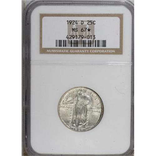 <B>1924-D 25C MS67 </B></I> S<B> NGC.</B></I> Potent cartwheel luster illuminates this virtually stone-white Superb Gem. The mildly matte-like obverse is well preserved, while the reverse is essentially pristine. Some softness on the center of the head and the top of the date is customary for the issue, but the remaining design elements are sharp. Census: 3 in 67 <B> S</B></I>, none finer with a Star designation, one finer without Star (9/07).<BR><BR><B>Coin Engraver:</B> Hermon A. MacNeil<BR><BR><b>Shipping:</b> Coins & Currency (<a target="_blank" href="http://www.heritageauctions.com/common/shipping.php">view shipping information</a>)