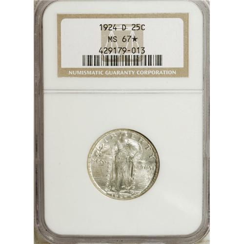 <B>1924-D 25C MS67 <img border='0' src='http://www.heritagecoins.com/images/star.gif' width=10 height=10> NGC.</B></I> Potent cartwheel luster illuminates this virtually stone-white Superb Gem. The mildly matte-like obverse is well preserved, while the reverse is essentially pristine. Some softness on the center of the head and the top of the date is customary for the issue. Census: 4 in 67 S, none finer with a Star designation (4/07).<BR><BR><b>Shipping:</b> Coins & Currency (<a target="_blank" href="http://www.heritageauctions.com/common/shipping.php">view shipping information</a>)