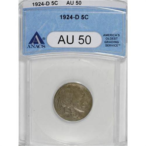<B>1924-D 5C AU50 ANACS.</B></I> NGC Census: (5/382). PCGS Population (8/593). Mintage: 5,258,000. Numismedia Wsl. Price for NGC/PCGS coin in AU50: $221. (#3952)<BR><BR><B>Coin Engraver:</B> James E. Fraser<BR><BR><b>Shipping:</b> Coins & Currency (<a target="_blank" href="http://www.heritageauctions.com/common/shipping.php">view shipping information</a>)