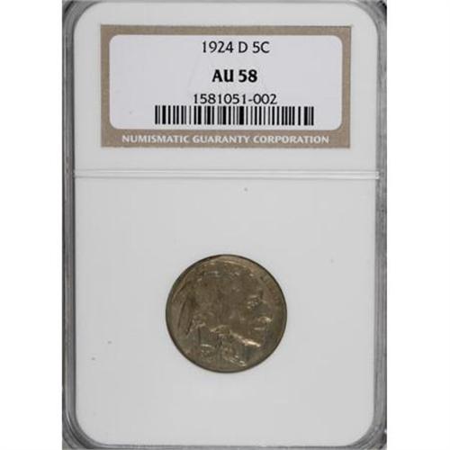 <B>1924-D 5C AU58 NGC.</B></I> NGC Census: (25/338). PCGS Population (35/522). Mintage: 5,258,000. Numismedia Wsl. Price for NGC/PCGS coin in AU58: $267. (#3952)<BR><BR><B>Coin Engraver:</B> James E. Fraser<BR><BR><b>Shipping:</b> Coins & Currency (<a target="_blank" href="http://www.heritageauctions.com/common/shipping.php">view shipping information</a>)