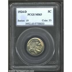 <TR><TD width="100%"><TABLE cellSpacing=1 cellPadding=3 width="100%" border=0><TBODY><TR><TD width="100%" bgColor=#79735c><FONT face=arial color=#ffffff size=3><B>Description</B> </FONT></TD></TR><TR><TD width="100%" bgColor=#ffffff><FONT face=arial size=2><B>1924-D 5C MS63 PCGS.</B></I> Sea-green, lemon, and ruby-red patina enlivens this shimmering and unabraded nickel. Typically struck as is usual for the issue, but the mintmark is clear. The obverse margin near 5 o'clock has a couple of miniscule carbon flecks. </FONT></TD></TR></TBODY></TABLE></TD></TR></TBODY></TABLE><BR><A name=PricesRealized></A><TABLE cellSpacing=0 cellPadding=0 width="100%" bgColor=#000000 border=0><TBODY><TR><TD width="100%"><TABLE cellSpacing=1 cellPadding=3 width="100%" border=0><TBODY><TR><TD width="100%" bgColor=#79735c><A name=PR><FONT face=arial color=#ffffff size=3><B>Previous Prices from Heritage Auctions</B> </FONT></A></TD></TR><TR><TD bgColor=#f6f6ed><TABLE cellSpacing=0 cellPadding=0 width="100%" border=1><TBODY><TR><TD align=middle width="33%"><B>Date</B></TD><TD align=middle width="33%"><B>Service</B></TD><TD align=middle width="33%"><B>Price</B></TD></TR><TR bgColor=whitesmoke><TD width="33%"><B>06/05/2001</B></TD><TD width="33%">PCGS</TD><TD width="33%">$700.00</TD></TR><TR bgColor=whitesmoke><TD width="33%"><B>08/01/2000</B></TD><TD width="33%">PCGS</TD><TD width="33%">$575.00</TD></TR><TR bgColor=whitesmoke><TD width="33%"><B>05/01/1998</B></TD><TD width="33%">PCGS</TD><TD width="33%">$770.00</TD></TR><TR bgColor=whitesmoke><TD width="33%"><B>05/01/1998</B></TD><TD width="33%">PCGS</TD><TD width="33%">$770.00</TD></TR><TR bgColor=whitesmoke><TD width="33%"><B>08/08/1998</B></TD><TD width="33%">NGC</TD><TD width="33%">$605.00</TD></TR></TBODY></TABLE></TD></TR><TR><TD bgColor=#ffffff><FONT face=arial size=1 ?>PLEASE NOTE: All prices realized reflect the final hammer price PLUS the buyer's premium in auctions that charge a buyer's premium. Each item has a notation at the top of the listing indicating whether that lot included a buyer's premium. Example: A item that sells with a final hammer price of $100 and a 20% buyer's premium will display with a price realized of $120. All information listed is intended to be as accurate as possible, but errors are possible. Please use this guide carefully and inform us of any inaccuracies. </FONT></TD></TR></TBODY></TABLE></TD></TR></TBODY></TABLE><BR><TABLE cellSpacing=0 cellPadding=0 width="100%" bgColor=#000000 border=0><TBODY><TR><TD width="100%"><TABLE cellSpacing=1 cellPadding=3 width="100%" border=0><TBODY><TR><TD width="100%" bgColor=#79735c colSpan=6><FONT face=arial color=#ffffff size=3><B>Price Guide*</B> </FONT></TD></TR><TR bgColor=#f6f6ed><TD align=middle><B>Grade</B> </TD><TD align=middle><B>Coin World<BR>(Trends)</B> </TD><TD align=middle><B>Numismedia<BR>Retail</B> </TD><TD align=middle><B>Numismedia<BR>Wholesale</B> </TD><TD align=middle><B>Coin<BR>Universe</B> </TD><TD align=middle><B>Heritage<BR>Value Index</B> </TD></TR><TR bgColor=#ffffff><TD align=middle>62</TD><TD align=right>$600.00</TD><TD align=right>$540.00</TD><TD align=right>$450.00</TD><TD align=right>---</TD><TD align=right>$465.28</TD></TR><TR style="FONT-WEIGHT: bold" bgColor=#cccfdd><TD align=middle>63</TD><TD align=right>$1,000.00</TD><TD align=right>$840.00</TD><TD align=right>$700.00</TD><TD align=right>$900.00</TD><TD align=right>$659.38</TD></TR><TR bgColor=#ffffff><TD align=middle>64</TD><TD align=right>$1,500.00</TD><TD align=right>---</TD><TD align=right>$1,125.00</TD><TD align=right>$1,350.00</TD><TD align=right>$956.00</TD></TR><TR bgColor=#ffffff><TD colSpan=6><FONT size=1>*All information listed is intended to be as accurate as possible, but errors are possible. No item may be returned or refused based on this information which is provided as a service to our customers. You should contact each pricing source directly to determine the accuracy of this information. </FONT></TD></TR></TBODY></TABLE></TD></TR></TBODY></TABLE><BR><TABLE cellSpacing=0 cellPadding=0 width="100%" bgColor=#000000 border=0><TBODY><TR><TD width="100%"><TABLE cellSpacing=1 cellPadding=3 width="100%" border=0><TBODY><TR><TD width="100%" bgColor=#79735c><FONT face=arial color=#ffffff size=3><B>Population Guide</B> </FONT></TD></TR><TR bgColor=#ffffff><TD align=middle><!-- Begin Output of Population Grid--><TABLE cellSpacing=0 cellPadding=0 width="100%" border=0><TBODY><TR><TD vAlign=center><TABLE cellSpacing=0 width="100%" border=1 cellsadding="3"><TBODY><TR><TD vAlign=center><TABLE cellSpacing=0 cellPadding=3 width="100%" border=1><TBODY><TR><TD vAlign=center align=middle bgColor=#f0f1e8 colSpan=2 <CENTER><FONT face=Arial size=2><B>PCGS Pop </B></FONT><CENTER></CENTER></TD><TD vAlign=center align=middle bgColor=#f0f1e8 colSpan=2><CENTER><FONT face=Arial size=2><B>NGC Pop</B></CENTER></FONT></TD></TR><TR><TD vAlign=center><FONT face=Arial size=2>(63)</FONT> </TD><TD vAlign=center align=right><FONT face=Arial size=2>86</FONT> </TD><TD vAlign=center><FONT face=Arial size=2>(63)</FONT> </TD><TD vAlign=center align=right><FONT face=Arial size=2>39</FONT> </TD></TR><TR><TD vAlign=center><FONT face=Arial size=2>(>63)</FONT> </TD><TD vAlign=center align=right><FONT face=Arial size=2>299</FONT> </TD><TD vAlign=center><FONT face=Arial size=2>(>63)</FONT> </TD><TD vAlign=center align=right><FONT face=Arial size=2>167</FONT> </TD></TR></TBODY></TABLE></TD></TR></TBODY></TABLE></TD></TR></TBODY></TABLE><!-- End Output of Population Grid--></TD></TR></TBODY></TABLE></TD></TR></TBODY></TABLE><BR><TABLE cellSpacing=0 cellPadding=0 width="100%" bgColor=#000000 border=0><TBODY><TR> Important notice: We expect to be auctioning lots at the rate of 200-250 per hour. On occasion eBay live bid software cannot keep up with the pace of the auctions where 4-5 lots per minute can hammer down, so we recommend that you place a realistic absentee bid now as insurance to avoid disappointment. Also please note that all He