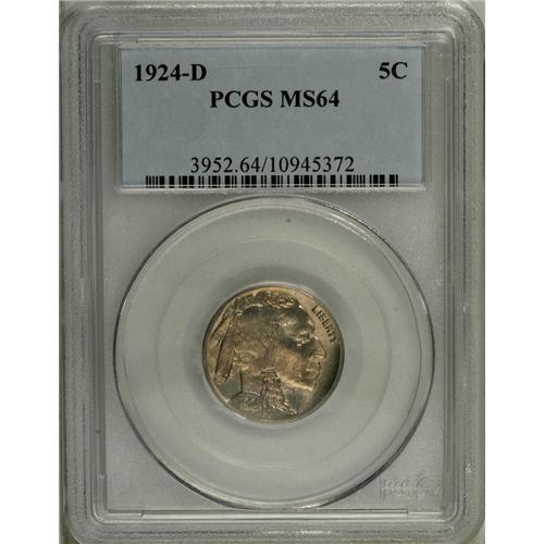 <B>1924-D 5C MS64 PCGS.</B></I> Lightly gold-toned overall with a touch of blue on the reverse. Lustrous with a slightly above-average strike, though the highpoint detail is still incomplete.<BR><BR><b>Shipping:</b> Coin/Currency (<a target="_blank" href="http://www.heritageauctions.com/common/shipping.php">view shipping information</a>)