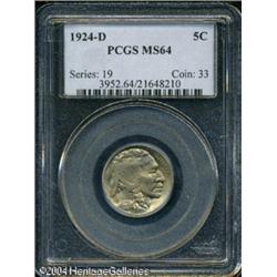 1924-D 5C MS64 PCGS. Lilac and olive colors enrich <B>1924-D 5C MS64 PCGS.</B></I> Lilac and olive colors enrich this lustrous and splendidly preserved near-Gem. Some softness of strike in the centers and on the top of the bison's head is characteristic of branch mint production from this era, however, the date, mintmark, and LIBERTY are bold. <BR><BR><B>Important notice:</B> Heritage usually auctions material at the rate of 200-250 lots per hour. On some occasions eBay Live bid software or the Internet may not be able to keep up with the pace of the auction. We recommend placing a realistic absentee bid now as insurance to avoid disappointment. Occasionally the auctioneer may eliminate or reject an eBay Live bid, and the auctioneer may also reopen a lot after the close of the eBay live bidding (usually because we missed an audience bid), and may reject your bid even if it shows you as the winning bidder. By bidding via eBay Live, you agree that Heritage may award the lot to another bidder at its sole discretion under the circumstances described above or any other reasonable circumstances. Since eBay bids are not shown to us until we open the lot on the floor, we treat those bids just like floor bids. In most cases the floor responds before the eBay bid is presented to us, due to Internet lag time, so for consistency we have made it a policy that floor bids are always considered first over tie eBay live bids. Also please note that all Heritage lots purchased through eBay Live carry a 20% Buyer's Premium. Please make sure you read the Terms and Conditions before you bid. This lot is being auctioned in conjunction with a live floor auction by Heritage Galleries & Auctioneers. All final auction and invoice information will be supplied by Heritage Galleries & Auctioneers, and all other information should be considered preliminary. Lot:5589