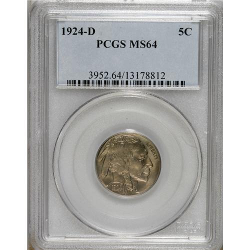 <B>1924-D 5C MS64 PCGS.</B></I> Well struck for the issue, and lightly toned. The obverse has lilac-olive coloration while the reverse is a confirmed reddish hue. Strong underlying satiny mint luster.<BR><BR><b>Shipping:</b> Coins & Currency (<a target="_blank" href="http://www.heritageauctions.com/common/shipping.php">view shipping information</a>)
