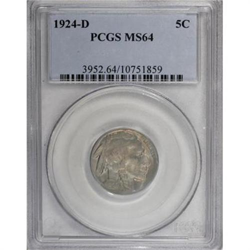 <B>1924-D 5C MS64 PCGS.</B></I> Powder-blue and tan-brown alternate across this beautiful and smooth near-Gem. The strike is suitable, and carbon is minimal. A minor retained lamination is noted east of the mintmark.<BR><BR><B>Coin Engraver:</B> James E. Fraser<BR><BR><b>Shipping:</b> Coins & Currency (<a target="_blank" href="http://www.heritageauctions.com/common/shipping.php">view shipping information</a>)