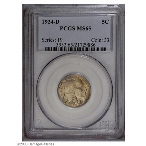 <B>1924-D<5C> MS65 PCGS.</B></I> A lustrous light golden-brown Gem with a reasonable strike and only a few tiny carbon specks. The date and LIBERTY are prominently strike doubled. Although not as rare as its San Francisco counterpart, the 1924-D is also a scarce issue in better Mint State grades, and is essentially unobtainable any finer. Population: 68 in 65, 1 finer (10/05).
