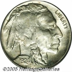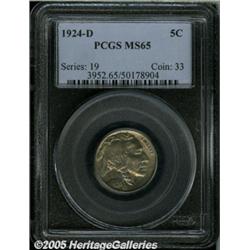 <B>1924-D 5C MS65 PCGS.</B></I> Better struck than most examples of this issue, but of course, still showing the flat spot at the front of the bison's head, probably a deficiency in the master die itself. The surfaces are bright and satiny with pale golden patina sprinkled over each side. This is an unusual opportunity for the advanced Buffalo Nickel collector. Population: 63 in 65, 1 finer (2/05).