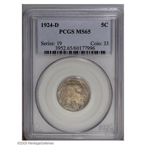 <B>1924-D<5C> MS65 PCGS.</B></I> Better struck than most examples of this issue, but of course, still showing the flat spot at the front of the bison's head, probably a deficiency in the master die itself. The surfaces are bright and satiny with rose and blue patina sprinkled over each side. This is an unusual opportunity for the advanced Buffalo Nickel collector to select from multiple Gem examples being offered in this sale.