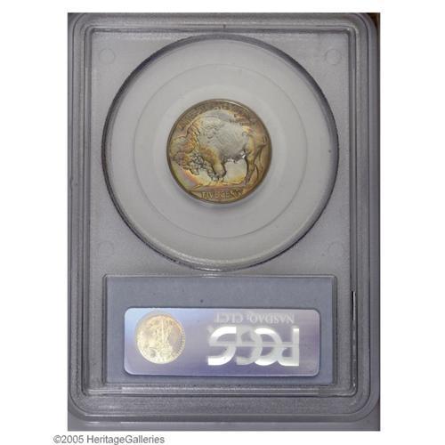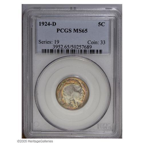 <B>1924-D<5C> MS65 PCGS.</B></I> Not only does that outstanding Gem '24-D Buffalo possess shimmering luster under superb toning, but the strike is appreciably sharper than the vast majority of this normally substandard issue. Ice-blue centers are surrounded by concentric circles of antique-gold, crimson-magenta, and mint-green at the peripheries. A couple of lateral marks are noted near the Indian's mouth that limit the grade. Population: 68 in 65, 1 finer (10/05).