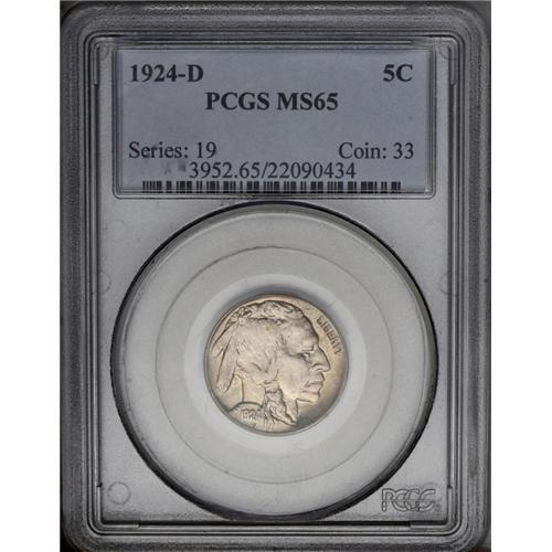 <B>1924-D<5C> MS65 PCGS.</B></I> The 1924-D is a highly respected condition and strike rarity in the Buffalo nickel series, and one that can be quite a challenge to locate as a Gem. Slightly weak on the bison's head, and over the obverse center, but otherwise well struck, with good luster, pleasing olive-gold and yellow-rose coloration, and very few wispy marks on either side. Excellent technical quality and overall eye appeal. Population: 76 in 65, 1 finer (3/06). <BR><BR><B>Important notice:</B> Heritage usually auctions material at the rate of 200-250 lots per hour. On some occasions eBay Live bid software or the Internet may not be able to keep up with the pace of the auction. We recommend placing a realistic absentee bid now as insurance to avoid disappointment. Occasionally the auctioneer may eliminate or reject an eBay Live bid, and the auctioneer may also reopen a lot after the close of the eBay live bidding (usually because we missed an audience bid), and may reject your bid even if it shows you as the winning bidder. By bidding via eBay Live, you agree that Heritage may award the lot to another bidder at its sole discretion under the circumstances described above or any other reasonable circumstances. Since eBay bids are not shown to us until we open the lot on the floor, we treat those bids just like floor bids. In most cases the floor responds before the eBay bid is presented to us, due to Internet lag time, so for consistency we have made it a policy that floor bids are always considered first over tie eBay live bids. Also please note that all Heritage lots purchased through eBay Live carry a 20% Buyer's Premium. Please make sure you read the Terms and Conditions before you bid. This lot is being auctioned in conjunction with a live floor auction by Heritage Galleries & Auctioneers. All final auction and invoice information will be supplied by Heritage Galleries & Auctioneers, and all other information should be considered preliminary. Lot:1077 <BR><BR><B>Winning Notification and Billing:</B> After the FINAL session in this auction is complete, Heritage will send e-mail and snail mail invoices. This process normally takes several days. All final auction and invoice information will be supplied by Heritage Galleries & Auctioneers, and all other information should be considered preliminary. <BR><BR>This auction will be conducted on a live auction floor and over the Internet through eBay Live. If you choose to place an absentee bid, please take a moment to <font color='#0000ff'><u><a href='http://pages.ebay.com/liveauctions/help/before/laabsentee.html'>learn how eBay Live absentee bidding works</a></u></font><font color='#000000'>