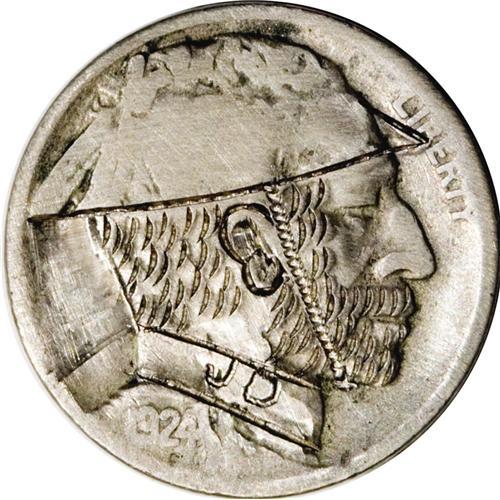 <B>1924-D:</B></I> A third Dorusa (modern). This is a copy of several "Bo" carved of his brother who, Del Romines writes, died in World War I; thus, the period helmet. A good deal of the Indian's hair is still visible on the helmet, and a mechanical tool was used for the chin strap and Dorusa's signature (J.D.) on the collar of this Good 1924-D. Average.<BR><BR><b>Shipping:</b> Coin/Currency (<a target="_blank" href="http://www.heritageauctions.com/common/shipping.php">view shipping information</a>)