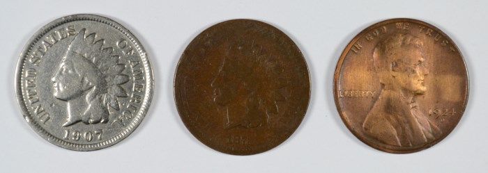 1924-D LINCOLN CENT F CLEANED, 1873 G, 1907 VG INDIAN CENTS