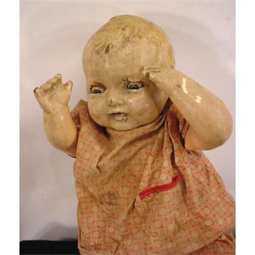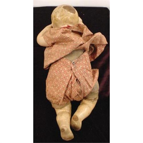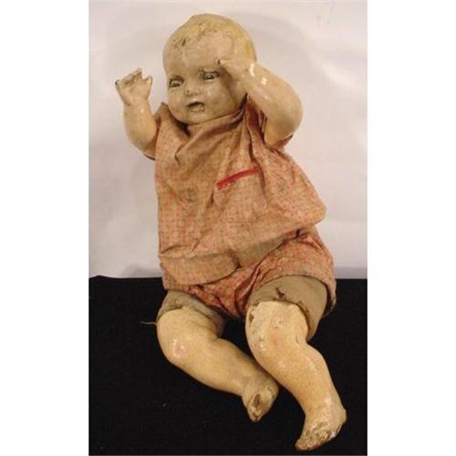 1924 Effanbee made in the USA with a comosition head,chest,arms and legs and a cloth & jointed hips with molded hair.It has lots of crazing and cracking to the composition.weighted sleeping eyes and 19" tall. it is all original and no repairs have been made. very good for its age.[280]