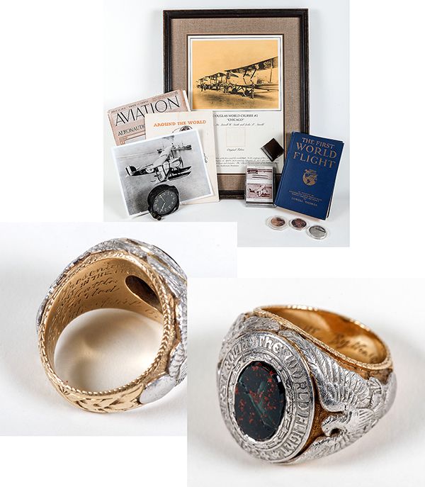 1924—first Around-The-World Flight – Co-Pilot's Commemorative Ring. One of the most sensational aviation events of the 1920’s was the around-the-world-flight by a team of U.S. Army Air Service Aviators. Lindbergh had not yet made his historic flight from New York to Paris when in 1924 four Douglas World Cruisers with 8 crewmen set out from Seattle, WA to attempt the first around-the-world airplane flight. 175 days later 3 of the aircraft and crews became the first to circumnavigate earth! It was not an easy accomplishment. Bad weather, engine problems and the distance all took their toll. Two planes crashed though one was replaced. On 9/28/24 three planes touched down in Seattle completing a 26,000 mile journey. The first was flag ship, Chicago followed by New Orleans, and Boston. The Seattle crashed and never completed the journey.