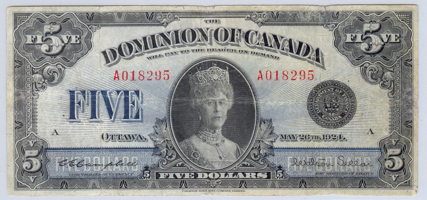 1924 Five Dollars, DC-27, PMG F-15, Campbell Sellar, Series A, Letter A, serial A018295, Comment on the back of certification: Restauration.