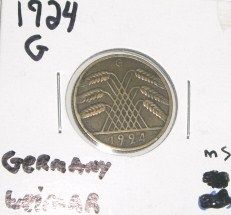 1924 G GERMANY WEIMAR *MS HIGH GRADE* *RARE HARD TO FIND*!! COIN CAME OUT OF SAFE BOX!! ***Coin, Currency & All Items Listed in this auction - Grades, Conditions and Values are not Safe Deposit Coins LLC Responsibilty. Grades, Condition and Values are determined by Consigner(s) & Buyers ONLY