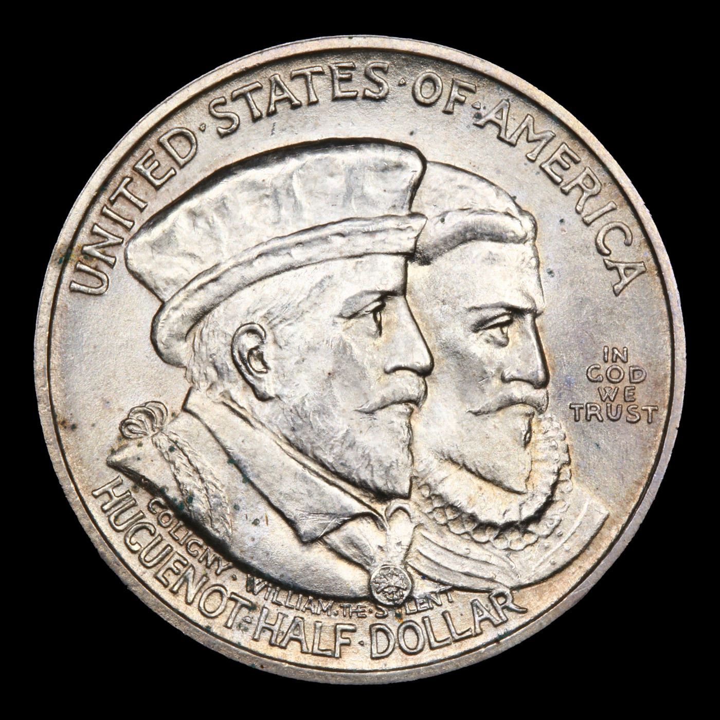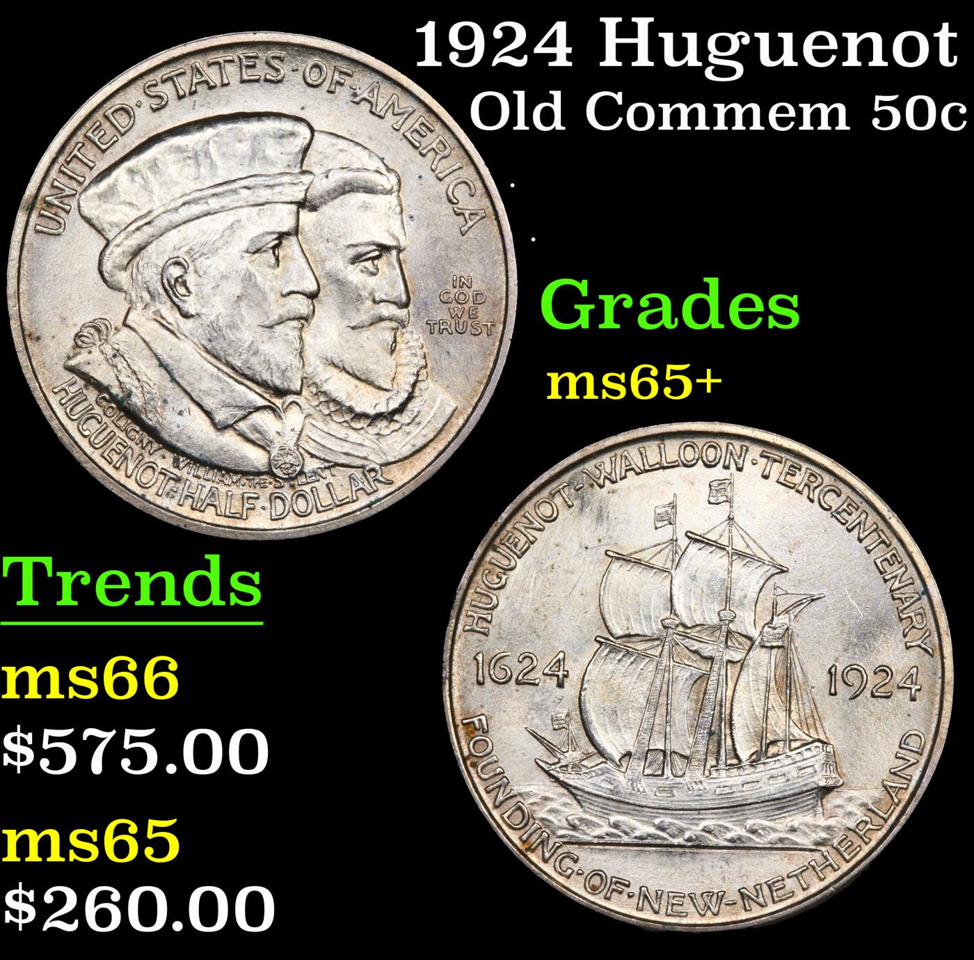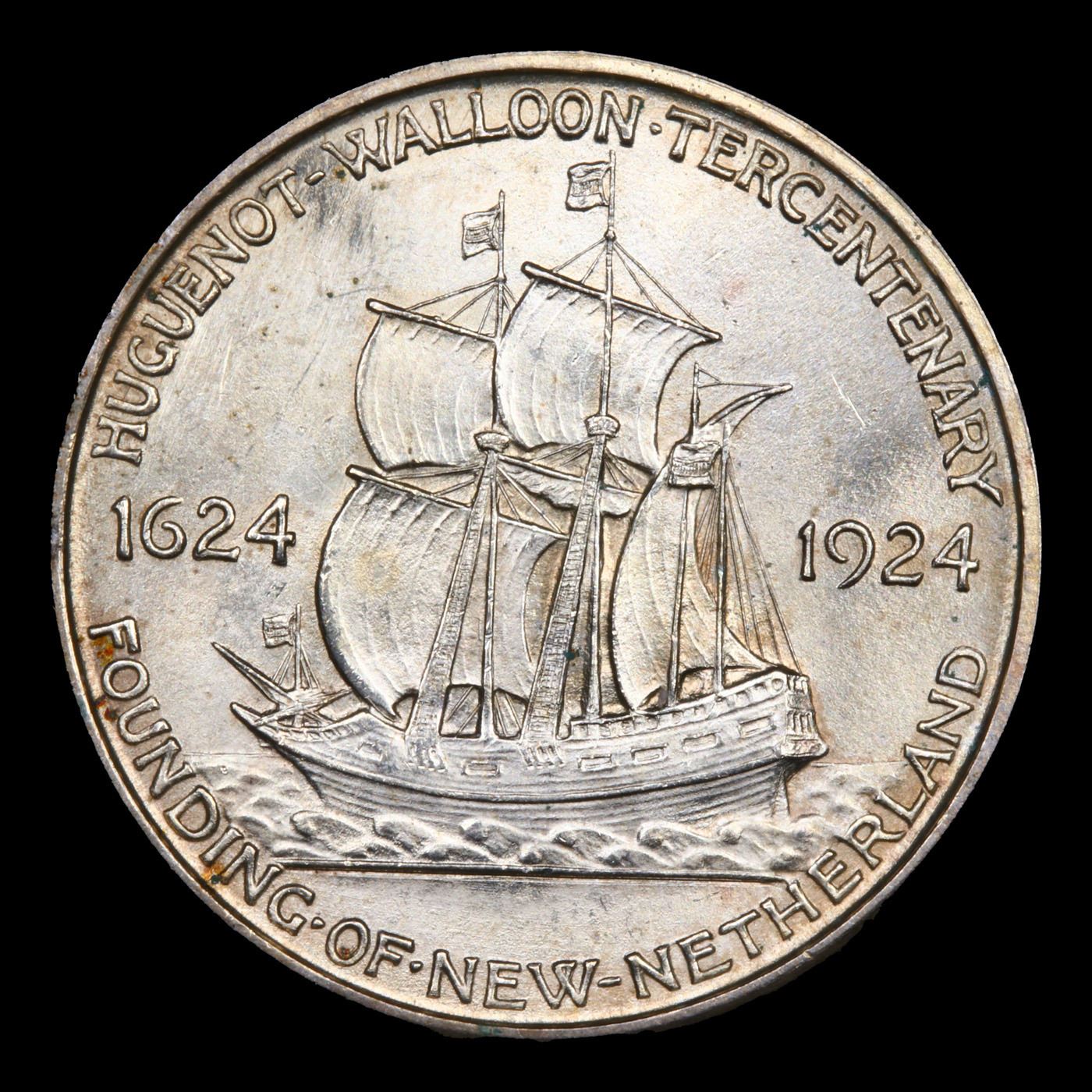 1924 Huguenot Old Commem Half Dollar 50c Grades GEM+ Unc. Issued to celebrate the 300th anniversary of the settlement of New Netherlands, the 1924 Huguenot Walloon Tercentenary Half Dollar was the only commemorative coin released for the year. The following year would see the issuance of coins under four different programs, the greatest number to date, although it would later be exceeded.The subject of commemoration was the founding of New Netherlands, now New York, by a group of Dutch colonists in 1624. A church group known as the Huguenot-Walloon New Netherland Commission sought the commemorative coin program, which was eventually approved. There was some controversy about the role of government in creating a fund raiser for a private church group, although the program proceeded.The obverse of the 1924 Huguenot Half Dollar featured portraits of Admiral Coligny and William the Silent. Although they were not involved in the settlement, they were viewed as leaders in the struggle for religious freedom.An image of the New Nederland is shown on the reverse. This is the ship that brought the settlers to the New World. Both the obverse and reverse were designed by George T. Morgan.