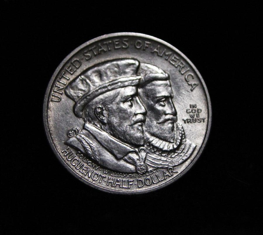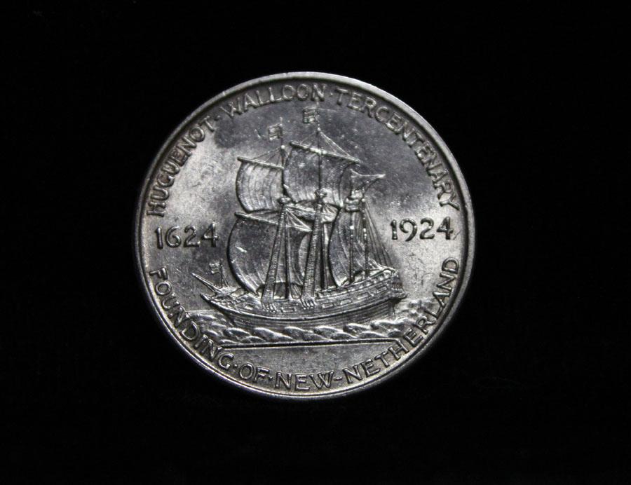 Very attractive example with good luster and a blast white color. The Huguenot-Walloon commemorative was created to celebrate the 300th anniversary of the founding of New Amsterdam (New York) The coin caused terrible controversy when created. The Huguenots and Walloons were French Protestants seeking religious freedom and the coin was condemned as a violation of Church and State and also derided for the depiction on the obverse of two Huguenot Martyrs who died a hundred years before the founding of New Amsterdam and having no relation to the event. The coin was designed by George T. Morgan, and numismatist at the time found the designs poor. Coin World's Coin Values lists ms65 at $400 and The Wholesale Greysheet lists ms65 at $310. Estimated Value $350