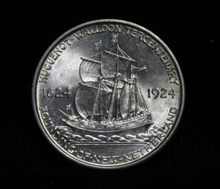 This example has frosty luster even and smooth throughout.  The Huguenot-Walloon commemorative was created to celebrate the 300th anniversary of the founding of New Amsterdam (New York)  The coin caused terrible controversy when created.  The Huguenots and Walloons were French Protestants seeking religious freedom and the coin was condemned as a violation of Church and State and also derided for the depiction on the obverse of two Huguenot Martyrs who died a hundred years before the founding of New Amsterdam and having no relation to the event.  The coin was designed by George T. Morgan, and numismatist at the time found the designs poor.   Coin World's Coin Values lists ms65 at $400 and The Wholesale Greysheet lists ms65 at $310.  Estimated Value $350