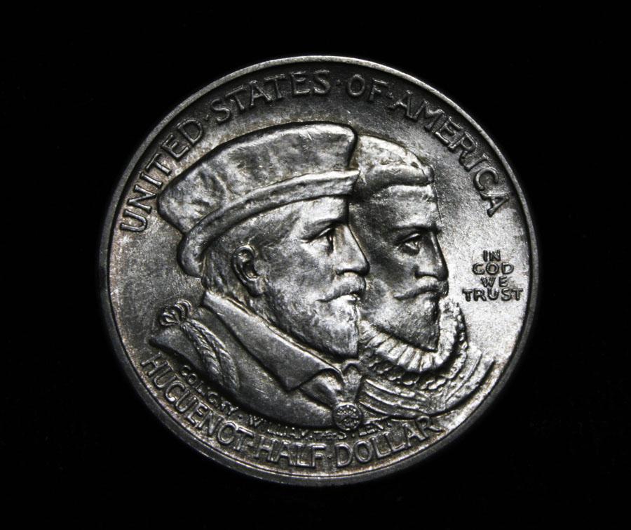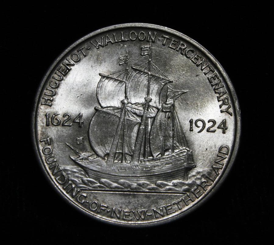 Beautiful original example with Great Luster and superior eye appeal. The Huguenot-Walloon commemorative was created to celebrate the 300th anniversary of the founding of New Amsterdam (New York) The coin caused terrible controversy when created. The Huguenots and Walloons were French Protestants seeking religious freedom and the coin was condemned as a violation of Church and State and also derided for the depiction on the obverse of two Huguenot Martyrs who died a hundred years before the founding of New Amsterdam and having no relation to the event. The coin was designed by George T. Morgan, and numismatist at the time found the designs poor. Coin World's Coin Values lists ms66 at $950 and The Wholesale Greysheet lists ms66 at $725. Estimated Value $750