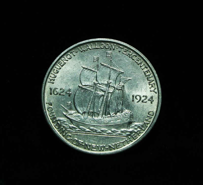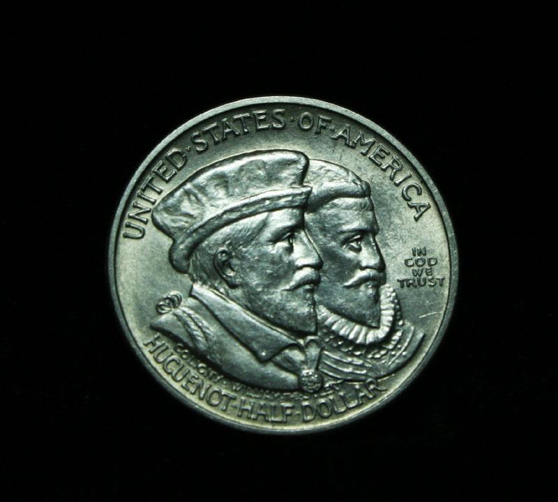 The Huguenot-Walloon commemorative was created to celebrate the 300th anniversary of the founding of New Amsterdam (New York) The coin caused terrible controversy when created. The Huguenots and Walloons were French Protestants seeking religious freedom and the coin was condemned as a violation of Church and State and also derided for the depiction on the obverse of two Huguenot Martyrs who died a hundred years before the founding of New Amsterdam and having no relation to the event. The coin was designed by George T. Morgan, and numismatist at the time found the designs poor. When examining a Huguenot the places to check for wear are Admiral Coligny’s cheekbone and the lower foresail and stern of the ship. The Wholesale Greysheet lists ms63 at $115. Estimated Value $125