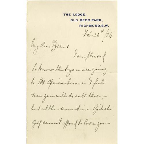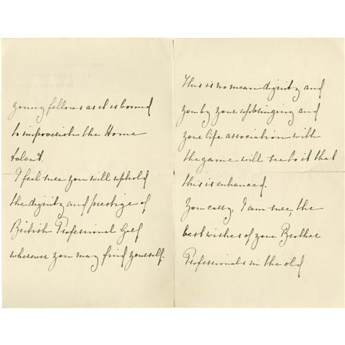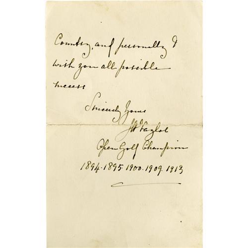 <B>1924 John H. Taylor Handwritten Letter with Fantastic Content.</B></I> Along with Harry Vardon and James Braid, Taylor formed Britain's "Great Triumvirate" of golfers in the late 19th and early 20th century, with each now representing a tremendous challenge for serious golf autograph collectors. Though Taylor's most productive days were behind him at the time he penned this note to a fellow linksman, it is noteworthy that he finished fourth in the British Open this year, at the advanced age of fifty-three. His elegant script in flawless black ink reads in part, "I am pleased to know that you are going to South Africa because I feel sure you will do well there, but at the same time British golf cannot afford to lose you young fellows as it is bound to impoverish the Home talent. I feel sure you will uphold the dignity and prestige of British Professional Golf wherever you may find yourself." Best is the closing "JH Taylor" signature, to which is added the glorious inscription, "Open Golf Champion 1894 - 1895 - 1900 - 1909 - 1913." The note is written on a single sheet of paper which has been folded into quarters, with the horizontal fold passing through Taylor's signature to minor effect. Very minor separation at the intersection of the two folds at center encounters no writing. <I>LOA from PSA/DNA.</B></I> <BR><BR><B>Important notice:</B> Heritage usually auctions material at the rate of 200-250 lots per hour. On some occasions eBay Live bid software or the Internet may not be able to keep up with the pace of the auction. We recommend placing a realistic absentee bid now as insurance to avoid disappointment. Occasionally the auctioneer may eliminate or reject an eBay Live bid, and the auctioneer may also reopen a lot after the close of the eBay live bidding (usually because we missed an audience bid), and may reject your bid even if it shows you as the winning bidder. By bidding via eBay Live, you agree that Heritage may award the lot to another bidder at its sole discretion under the circumstances described above or any other reasonable circumstances. Since eBay bids are not shown to us until we open the lot on the floor, we treat those bids just like floor bids. In most cases the floor responds before the eBay bid is presented to us, due to Internet lag time, so for consistency we have made it a policy that floor bids are always considered first over tie eBay live bids. Also please note that all Heritage lots purchased through eBay Live carry a 22.5% Buyer's Premium. Please make sure you read the Terms and Conditions before you bid. This lot is being auctioned in conjunction with a live floor auction by Heritage Galleries & Auctioneers. All final auction and invoice information will be supplied by Heritage Galleries & Auctioneers, and all other information should be considered preliminary. Lot:19190 <BR><BR><B>Winning Notification and Billing:</B> After the FINAL session in this auction is complete, Heritage will send e-mail and snail mail invoices. This process normally takes several days. All final auction and invoice information will be supplied by Heritage Galleries & Auctioneers, and all other information should be considered preliminary. <BR><BR>This auction will be conducted on a live auction floor and over the Internet through eBay Live. If you choose to place an absentee bid, please take a moment to <font color='#0000ff'><u><a href='http://pages.ebay.com/liveauctions/help/before/laabsentee.html'>learn how eBay Live absentee bidding works</a></u></font><font color='#000000'>