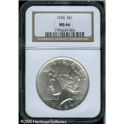 <B>1924<img border='0' src='http://www.heritagecoins.com/images/star.gif' width=10 height=10>$1 MS66 NGC.</B></I> Sharply struck and highly lustrous with brilliant silver surfaces. Without any evidence of toning, save for a couple slight milky spots. Lot:10701