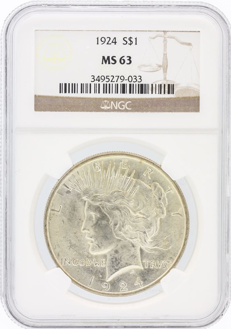 One 1924 NGC MS63 Peace Silver Dollar. NGC Certified.